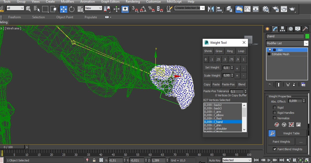 User, я заметил на скрине, что вес от руки l_hand распределился на другие кости по 0,059, это значит, что кость руки будет влиять на всё тело. Надо на l_hand единицу.