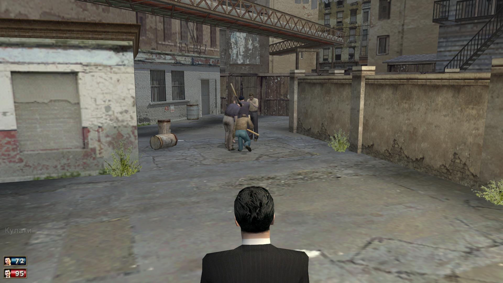 Естественно бежать и дальше за шкетом Полянскому не дадут. Быстренько всех вырубаем. Желательно лысого грохнуть последним, но это будет не так то просто, так как у него тут имеется "брат-близнец", который выбегает из за кирпичного забора с еще одним хмырём. Благо хоть оружием различаются - у первого бита, у второго фомка: