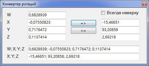 Конвертер ротаций — инструмент позволяет перевести значения углов поворота объекта из формата кватерниона (quat), в котором они хранятся в файле (4 значения от -1,0 до 1,0), в формат углов Эйлера (3 значения углов поворота в градусах вокруг осей координат) и обратно. Это позволяет получить совместимость с программами, отображающими поворот объектов в формате углов Эйлера (MWE, DCED и т.д.). Предусмотрена возможность передать значения кватерниона из основного окна программы в окно конвертера и обратно с помощью соответствующих кнопок, находящихся рядом с полями отображения значений поворота объекта.