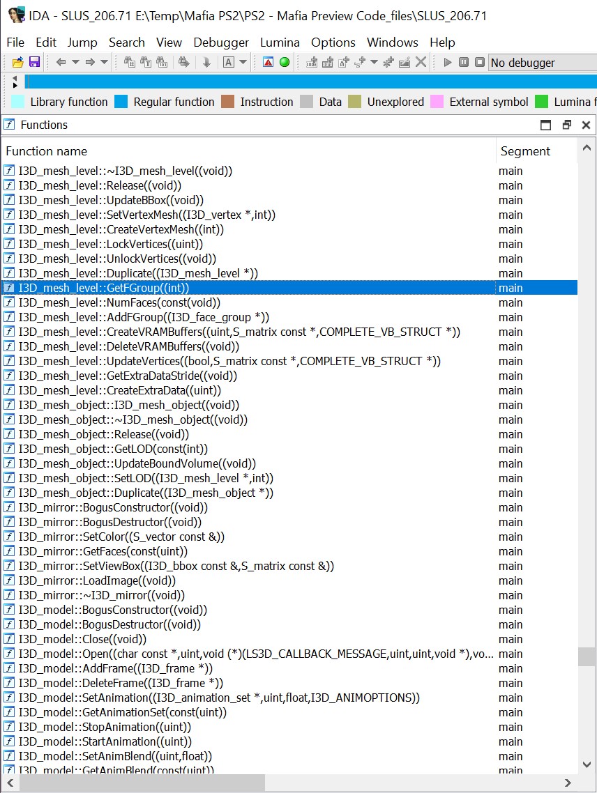 Декомпиляция происходит с ошибками, и псевдокод сгенерировать невозможно по причине другого процессора в приставке PS2. Но так или иначе, даже названия функций будут полезны для разбора PC версии.